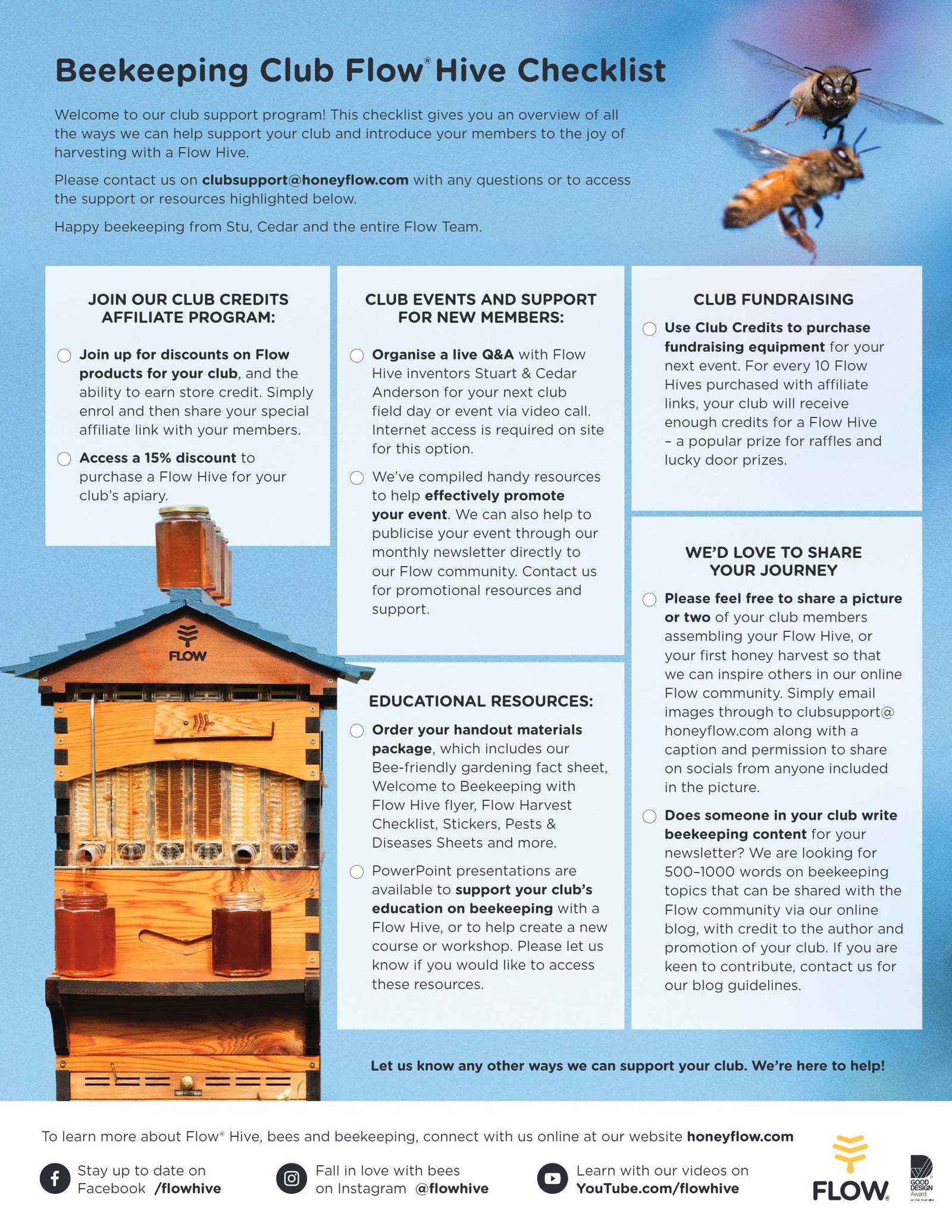 This checklist gives you an overview of all the ways we can help support your club and introduce your members to the joy of harvesting with a Flow Hive.