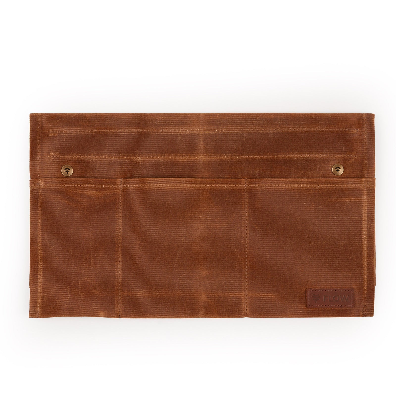 The waxed cotton tool roll is made from Global Organic Textile Standard (GOTS) cotton, features leather trims and has been wax-coated to provide a durable finish. Waxed cotton will develop a patina over time, resulting in a timeless vintage look.