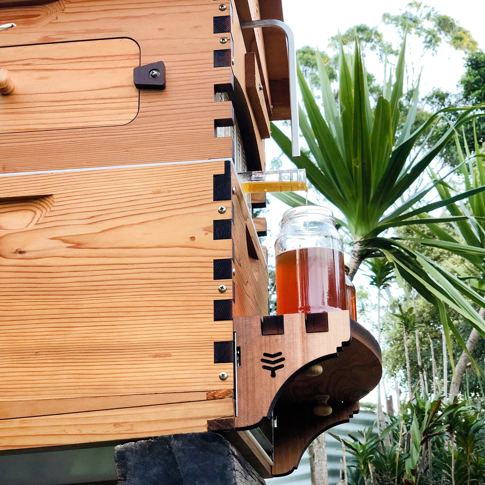 Precision laser cut and crafted from Western Red Cedar, this Flow Harvesting Shelf Bracket kit can be added to any Flow Hive Classic to convert your rear access cover into a handy height-adjustable harvesting shelf.