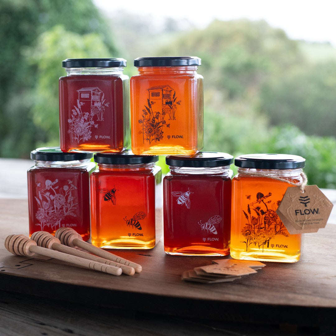Store and serve your honey in style with our Flow Honey Jar Gift Set, available in 12 or 24-pack options. Each set includes premium square, stackable glass jars with black metal lids for a secure, leak-proof seal. The jars feature unique printed artwork in black and white, perfect for showcasing light or dark honey.