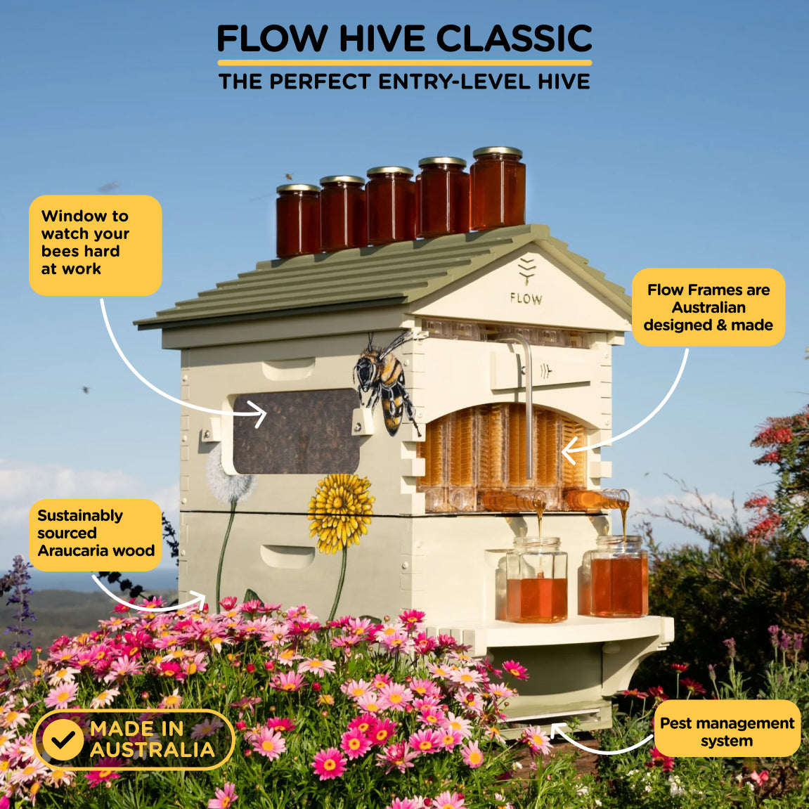 Featuring our best selling Flow Hive Classic – carefully crafted for experiencing the joy of harvesting honey directly from the hive, bundled with essential safety equipment plus a sweet saving.